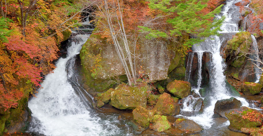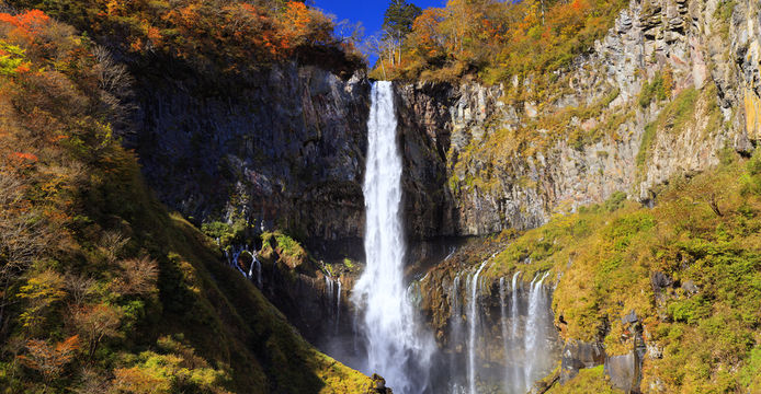 ▲ <華嚴瀑布> 華嚴瀑布-日本三大名瀑之一,著名遊覽地。中禪寺湖水形成東端的大尻川,橫切男體山,從700米高處流下形成瀑布主要部分,高99米。上部岩石向前突出,岩隙中流出12個小瀑布。秋季四周紅葉漫布,景觀幽美,為日光國立公園的遊覽中心,這裡非常適合拍照,有高山流水的意境。