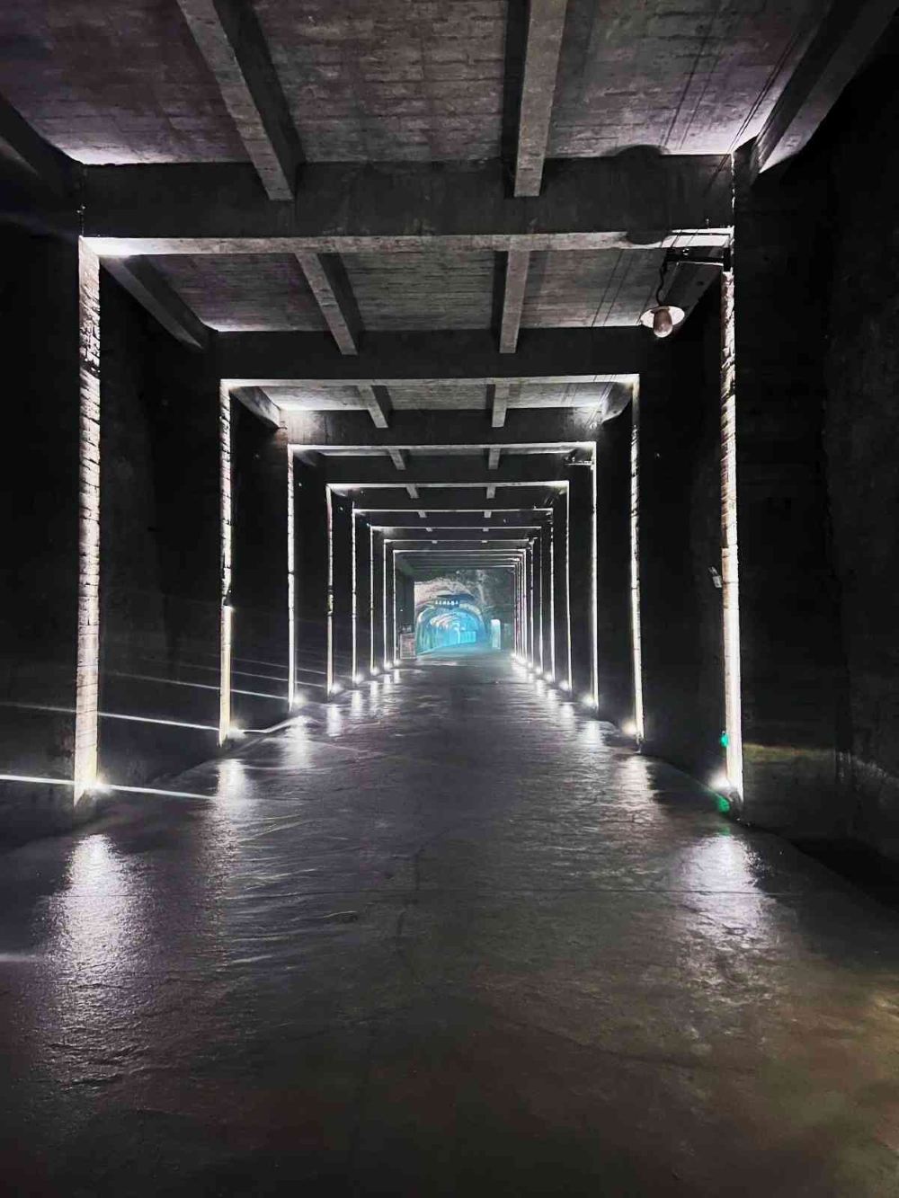 ▲ 這是816核工廠的一處隧道景觀,磚石砌成的拱形通道在幽藍燈光的渲染下,透著冷冽的科技感與歷史厚重感。隧道盡頭的緋紅光芒如秘境入口,腳下水面倒映著明暗燈帶,彷彿在訴說著曾經的軍工傳奇,將歷史的深沉與科幻的迷幻奇妙融合。