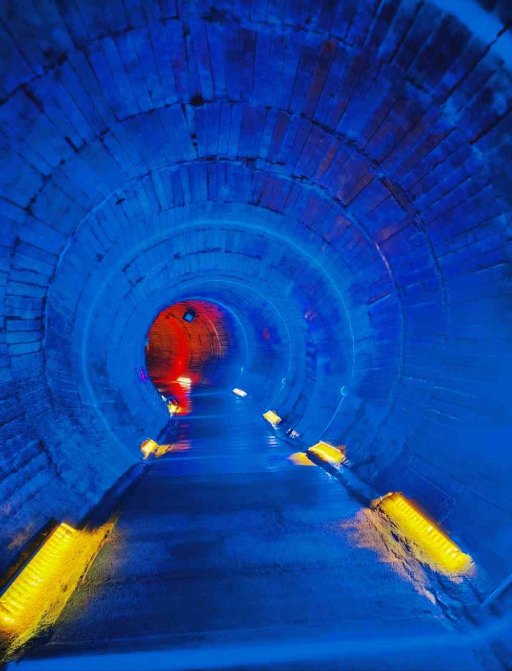 ▲ 深邃的816核工廠隧道宛如時光隧道,磚石拱頂在幽藍燈光下泛著冷冽金屬感,盡頭的緋紅光芒似秘境入口,腳下水面倒映著明暗燈帶,歷史的厚重與科幻的迷幻在此交織,每一塊磚石都在低語著昔日的軍工傳奇。
