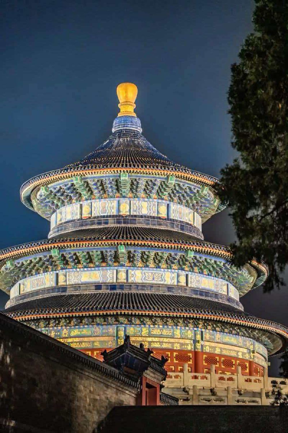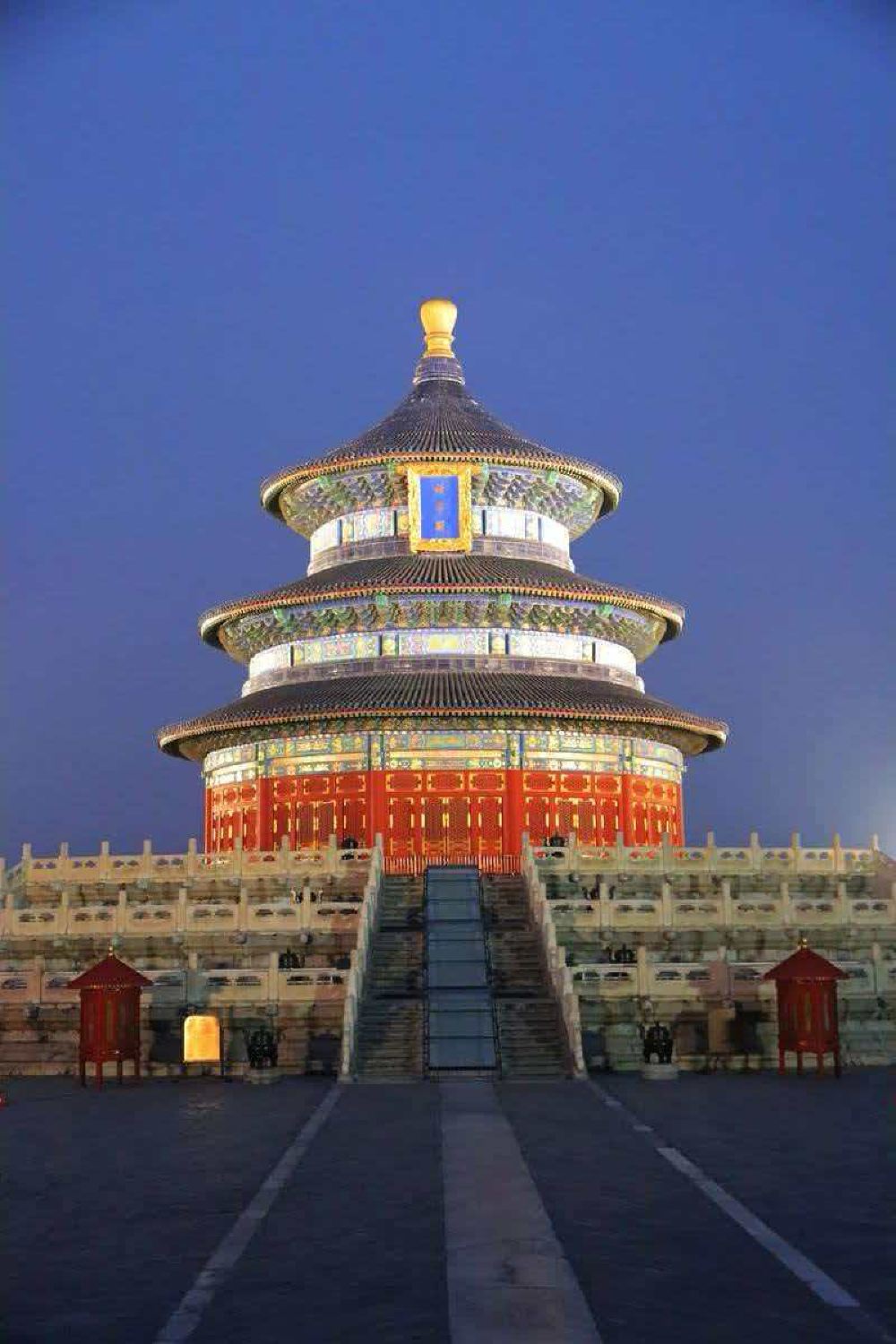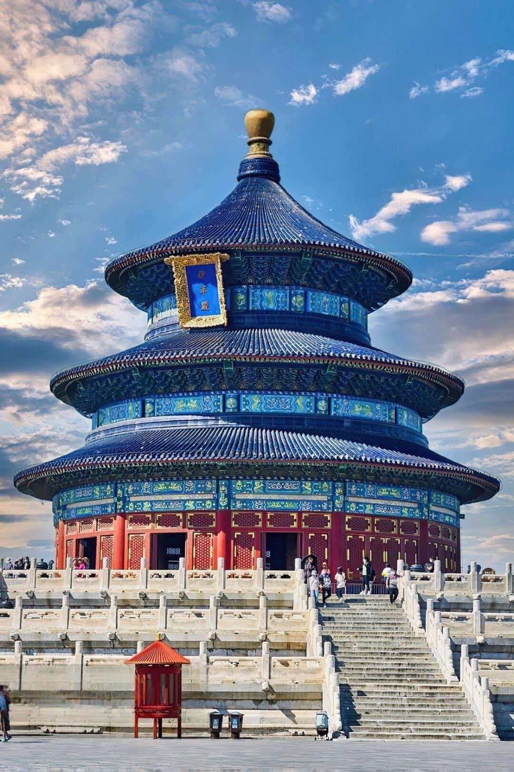 ▲ 祈年殿的三層圓形穹頂,以38米高度展現天人合一的建築美學,內部龍柱、金柱與巨柱分別象徵四季、月份與節氣。 圜丘壇的天心石傳說可助願望成真,壇面與台階均採用九或九的倍數設計,寓意九重天的至高無上。