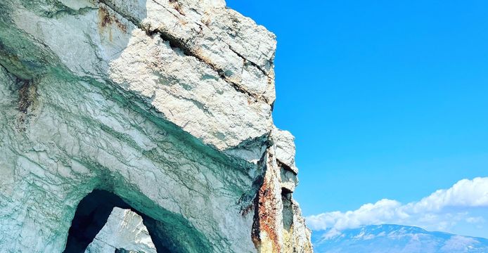 可以從山頂欣賞清澈的海水、陡峭的石灰岩地層以及白色沙灘中央一艘生鏽的舊船,沉浸在壯麗的藍色海水和天空