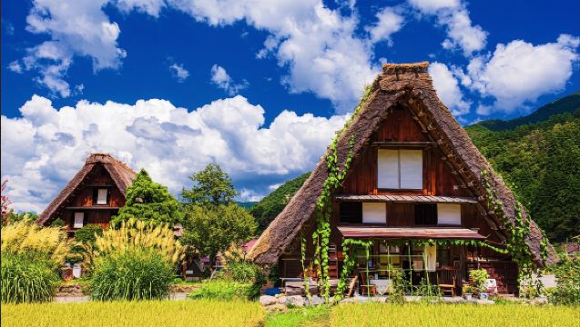 白川鄉,聯合國教科文組織世界遺產地,以其獨特的「合掌造」建築風格的傳統茅草屋農舍而聞名,四季皆如童話