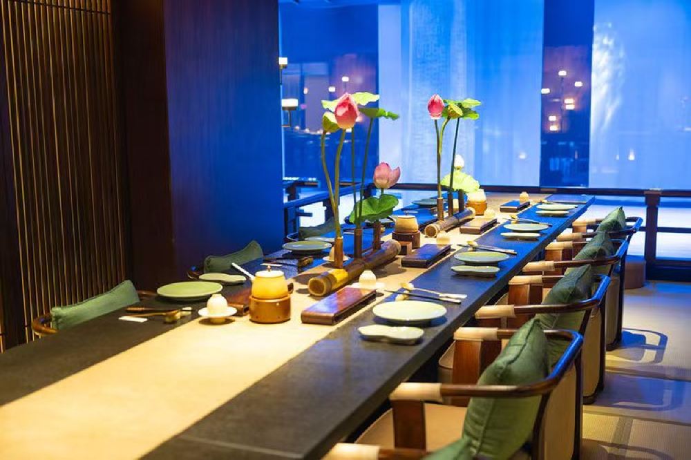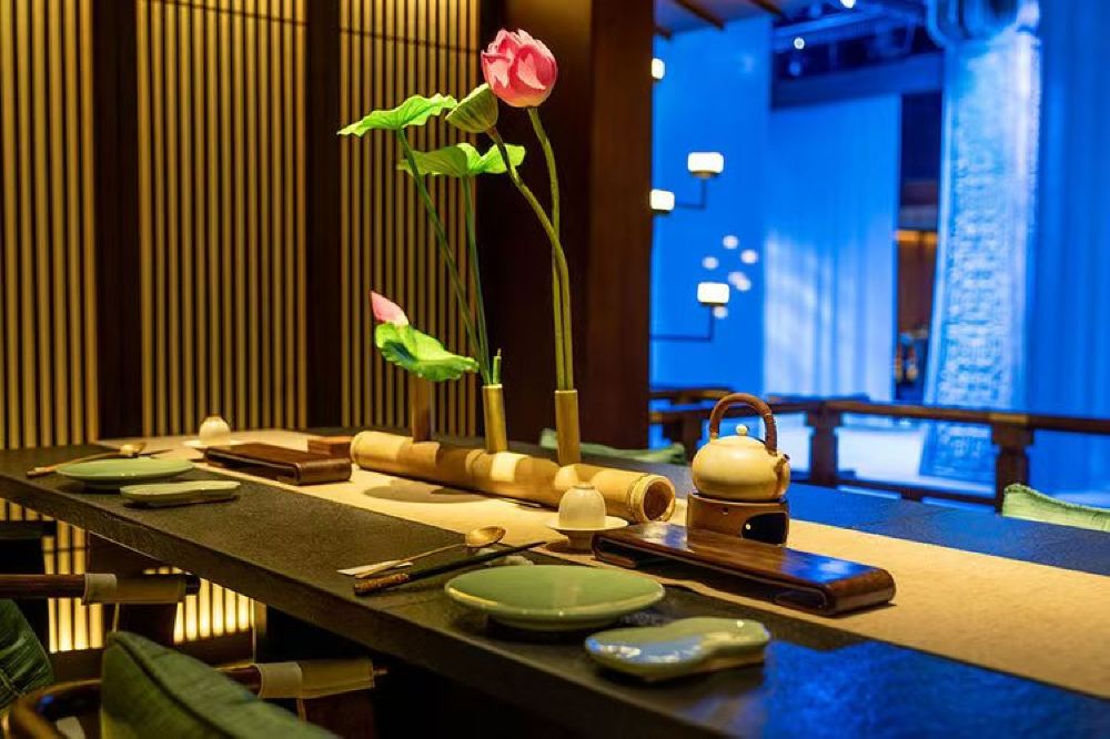 - 包廂長桌以荷枝、竹器裝飾,青綠餐具配木質座椅,格柵隔出私密區,宴飲空間既雅緻又具宮廷規制