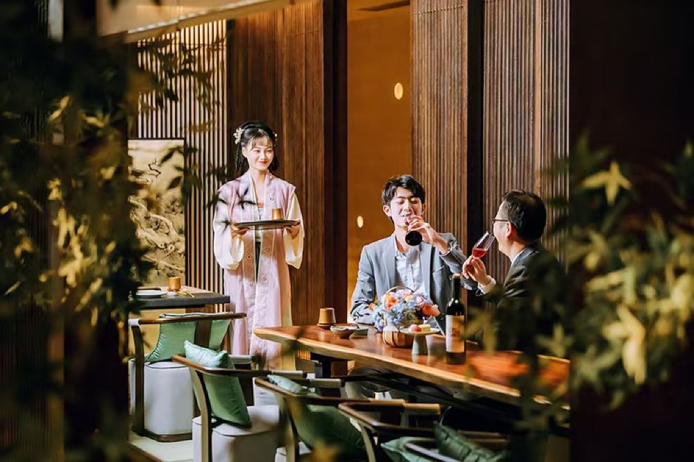 - 包廂內,侍女身穿漢服侍宴,賓客舉杯對酌,木質隔斷襯托雅緻陳設,私享空間中禮制服務與宴請氛圍兼備