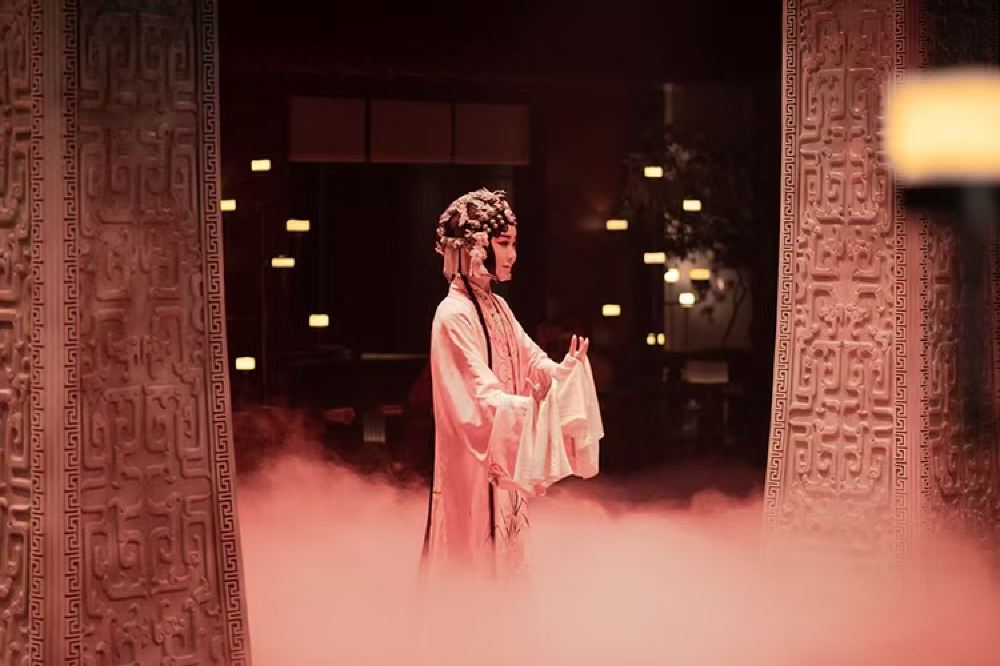 - 戲曲演員身著粉衫佇立於煙靄中,古紋立柱襯托暖燈,讓宴飲開場便沉浸於宮廷演藝的氛圍感裡