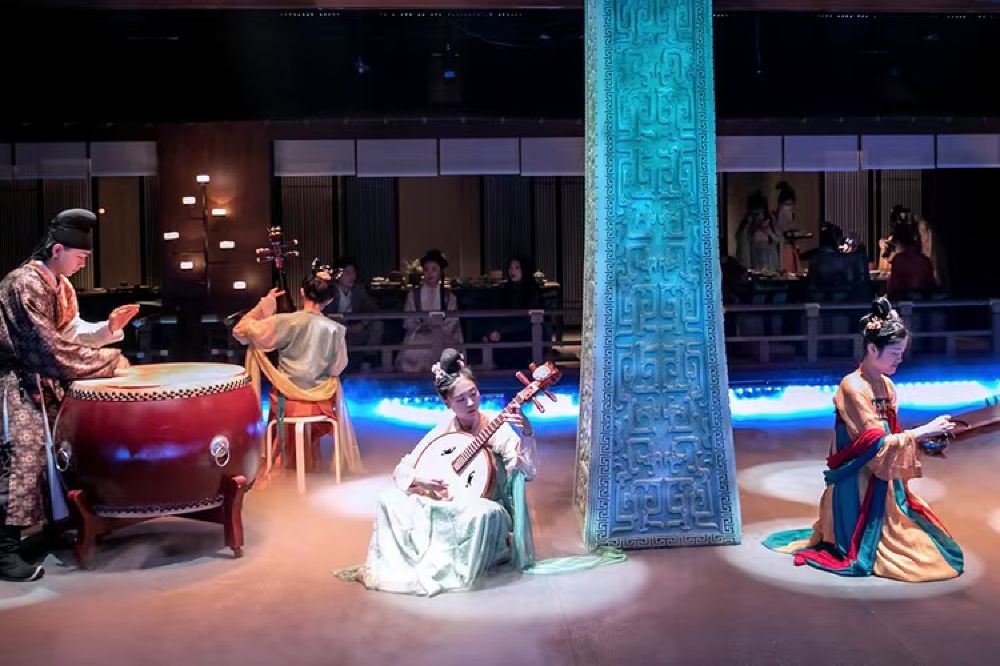 - 專屬演奏區,樂師身著古裝奏樂,青銅紋立柱襯托霧效燈光,讓宴飲全程伴隨絲竹雅韻,沉浸式感受宮廷禮樂