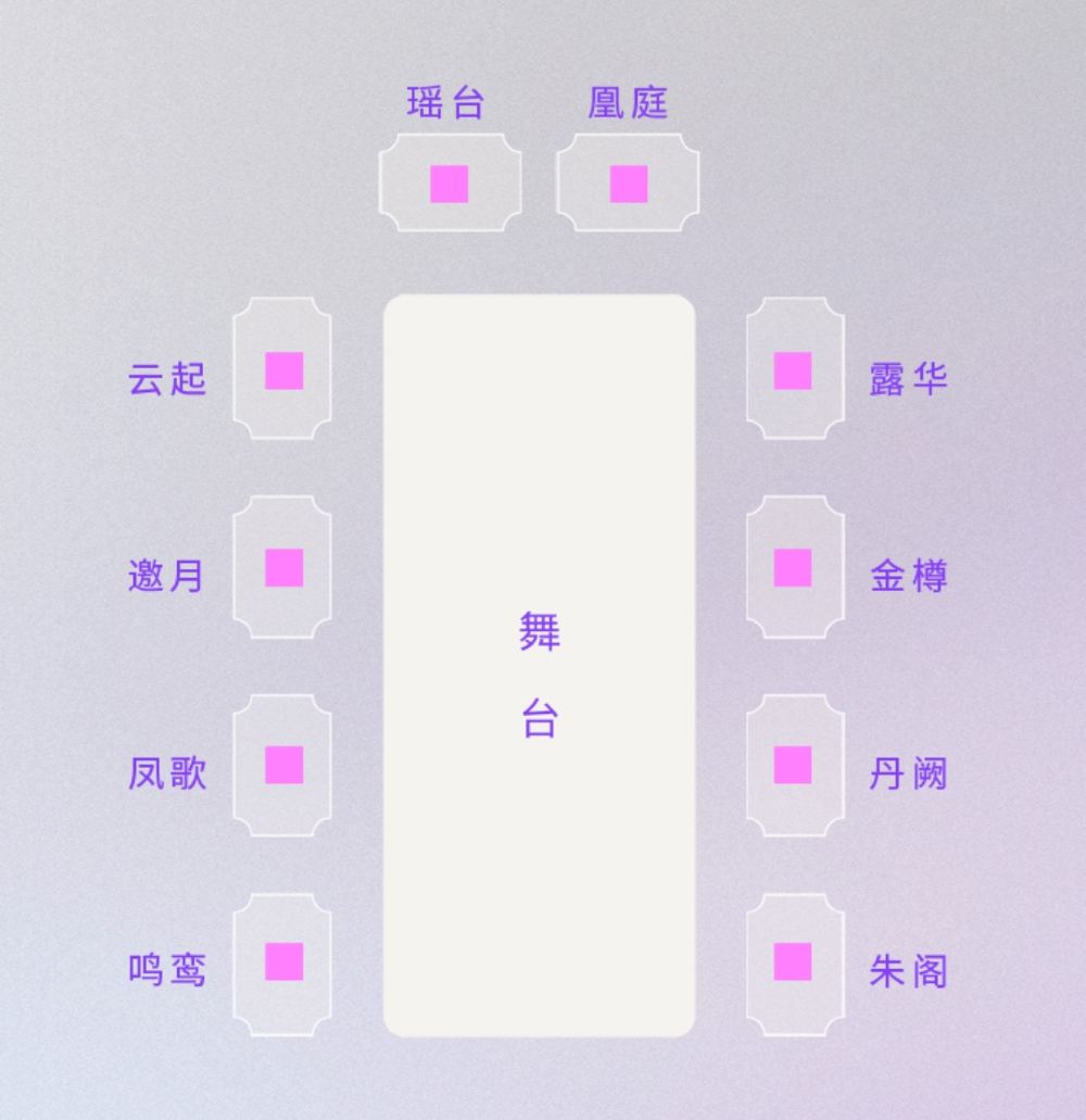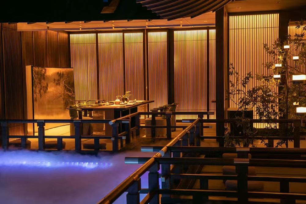 - 包廂以木質格柵、宮燈營造古雅氛圍,搭配水霧與藍紫燈光,私享靜謚宴飲空間,盡顯宮廷宴的雅緻與私密