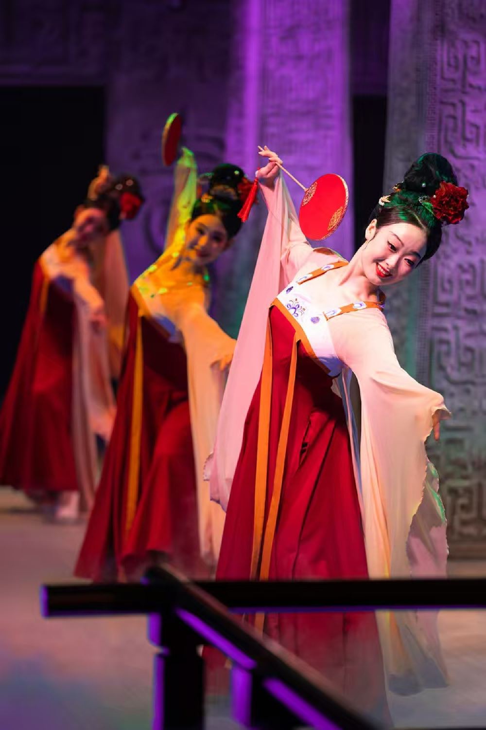- 舞者身著唐制華服執扇起舞,紫調燈光映襯古殿背景,讓宴飲時的沉浸式演藝更添宮廷韻致