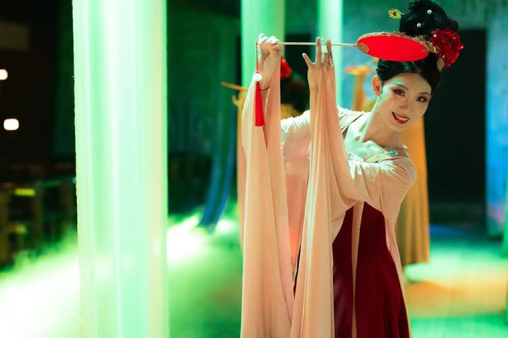 - 舞者身着唐裝展現水袖,青綠燈光映襯帷幔,宴飲時可近距離欣賞宮廷舞,讓私宴體驗更添沉浸感