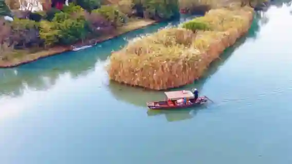 乘坐搖櫓船欣賞濕地風光,感受杭州休閒文化