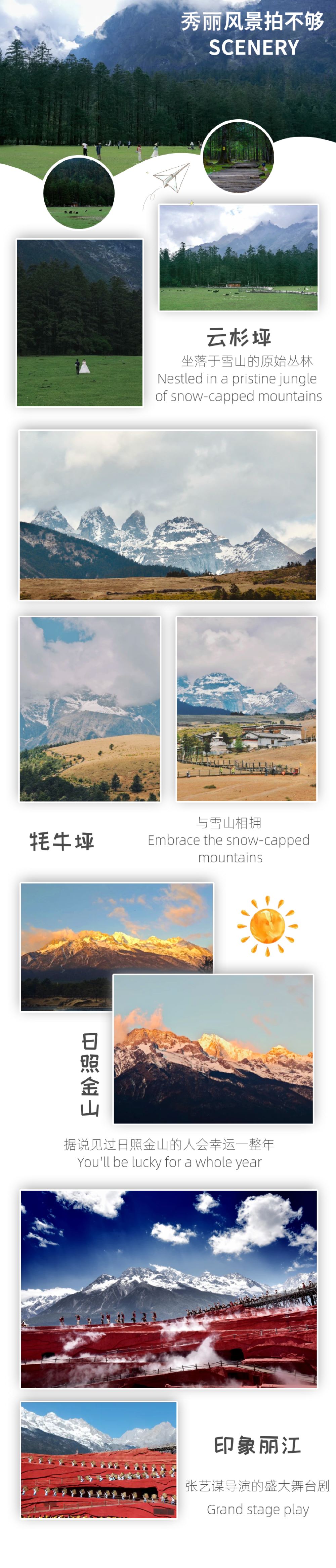 ▲ 大索道和雲杉坪小索道的區別:大索道上玉龍雪山4506的海拔可到觀景台4680米,雲杉坪小索道到達3356的雲杉坪高原草甸,可以遠觀雪山。 麗江古城及束河古鎮一圈的馬路邊接送,超出指定範圍,請自行前往上車點,行程時間僅為預估參考時間,具體遊玩順序、時間在不減少遊玩景點的情況下,需要根據索道時間段進行合理調整、雪山屬於半自由行,無導遊服務,師傅安排一天的遊玩行程,師傅不上索道,不進藍月谷,自然光無需講解,安排妥當後客人自行遊覽。