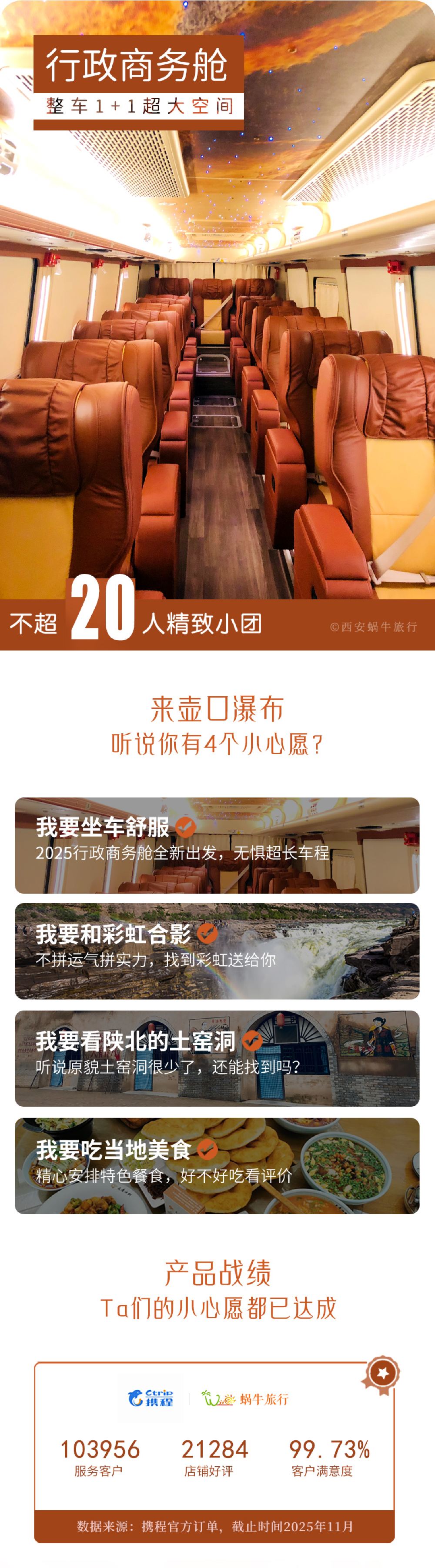 對於這次的旅程非常滿意。早上專車接送,和大巴匯合一起出發。專車司機和導遊還會提前一天電話做確認,還會morning call.壺口比較遠特地定了行政商務艙,座椅非常寬敞,單程3小時長途不累,很值得。一路上謝導的講解非常詳細,我們聽的都融入其中。也為我們考慮的很周到說,壺口比較冷建議大家帶帽子,非常細心。司機師傅開車技術很棒,車子開的非常平穩。有機會下次再參加謝導的團。