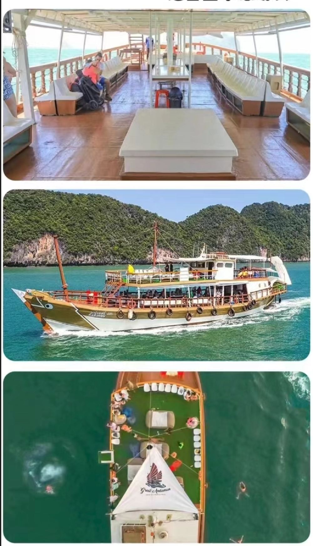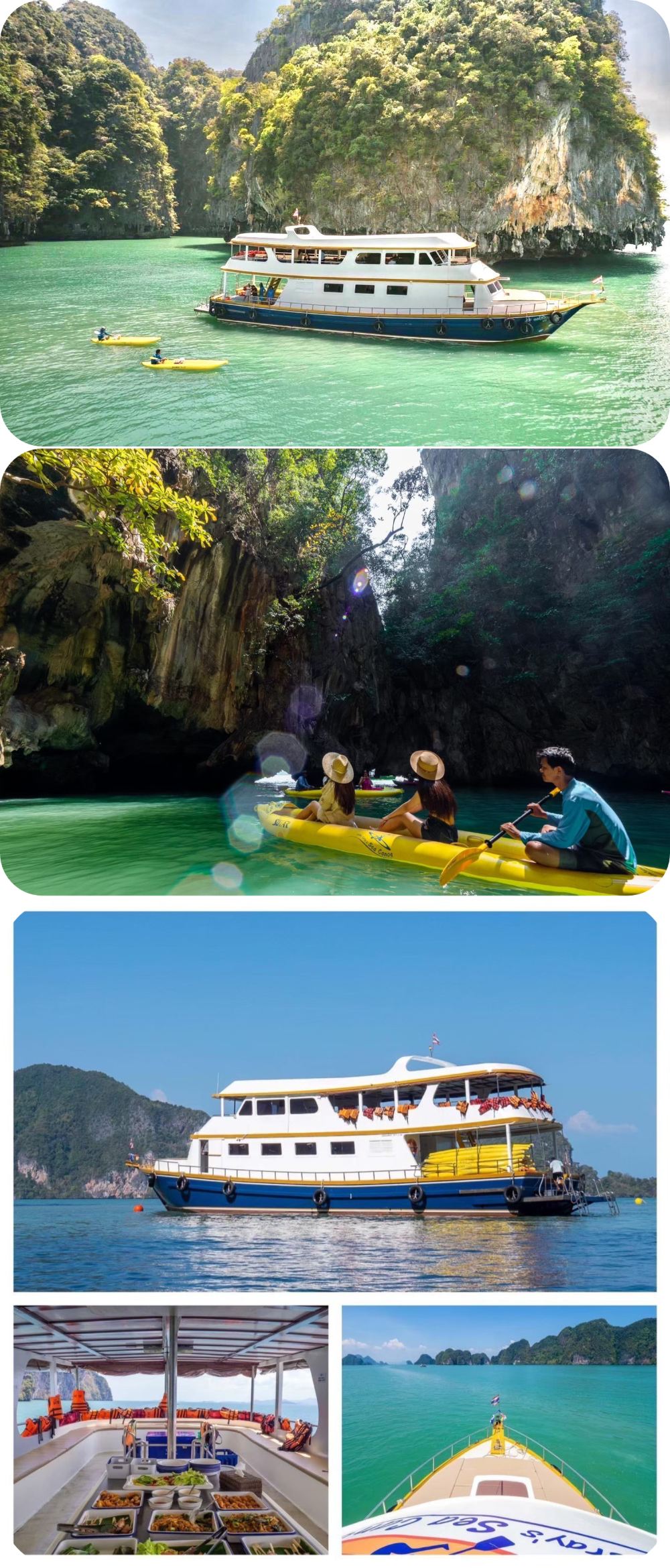 ▲ 4. Leader 大船——4島+3次皮划艇 ●3次皮划艇探秘,洞穴遊覽,平穩大船適合全家出行 ●07.30-08 30 : 司機前往酒店接您 ●9:30 抵達Leader Andaman 碼頭,享用簡單的點心和飲品後,出發前往攀牙灣國家公園