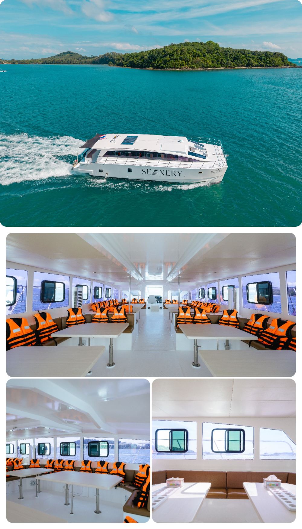 ▲ 2. 彩虹號雙體船(Rainbow Catamaran)——早鳥團 007島 + 洞穴探險 + 皮划艇 + 蛋島浮潛 ●7:00左右到您下榻的酒店接您前往LEAM NGA私家碼頭,享用簡單的早餐 ●9:00左右乘坐海星號前往攀牙灣國家公園