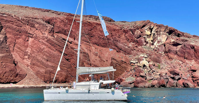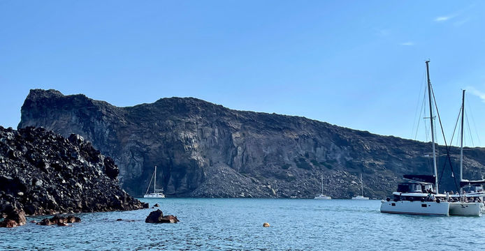 乘坐當地知名遊艇公司「Sunset Oia」的豪華雙體帆船,揚帆起航,從海上欣賞美麗的聖托里尼島。
