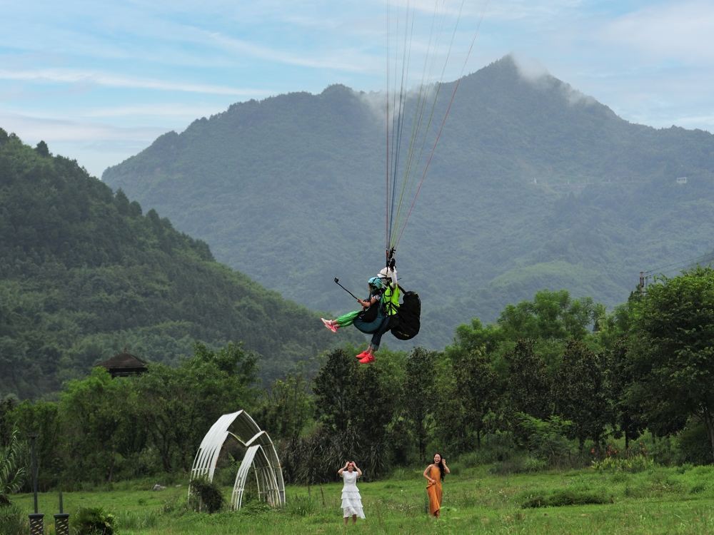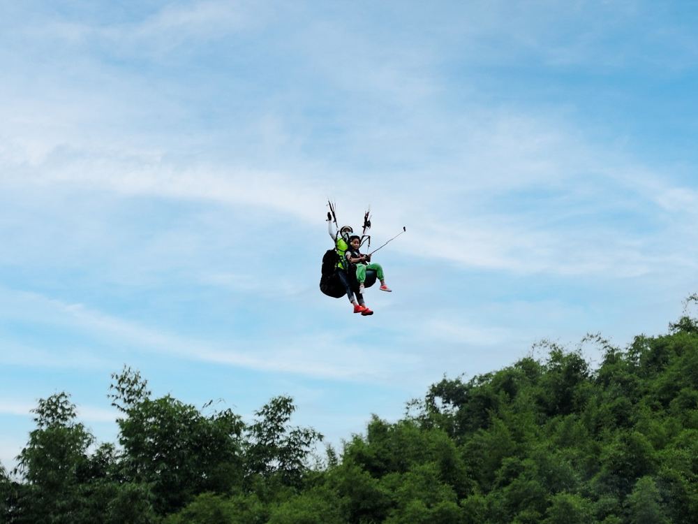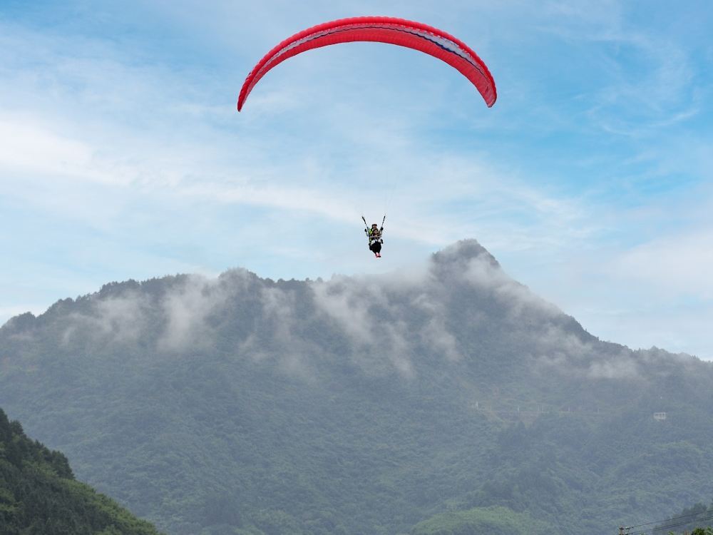 7、滑翔傘起傘(起飛)時,請您務必全力配合教練,身體微微前傾,協同用力,控制身體重心用力向教練指示方向奔跑,直至飛出山體為止;