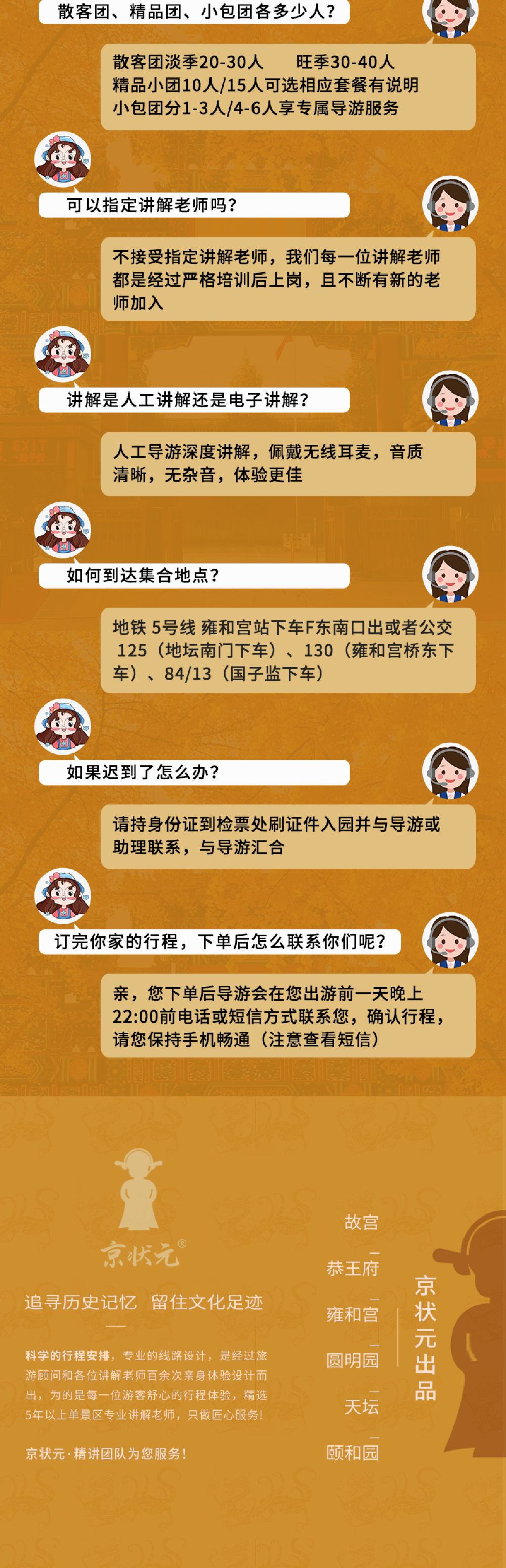 Part1:上午雍和宮遇到京狀元的莊老師是幸運的,他態度好、服務好、講得好,我們大家都能夠感受得到。另外,莊老師的講解非常有深度,可見他對佛家文化的瞭解以及豐富的歷史知識相結合,讓我大開眼界,知道了在拜佛時的注意事項並打破了我以往的無知,雖然雍和宮的人特別特別多,但是莊老師專業的講解彌補了很多不足,2分看8分聽,如果下次還有機會來雍和宮我會再次選擇莊老師的講解! Part2:下午恭王府的講解同樣由京狀元的曾老師講解,她同樣熱情服務好,講解得也非常不錯,對恭王府的歷史知識瞭如指掌,在講解過程中尤其注重和孩子們互動。恭王府參觀的人也特別多,儘管如此莊老師會帶我們到陰涼的地方邊休息邊講解。我發現京狀元不管是莊老師還是曾老師都講得非常不錯👍👍