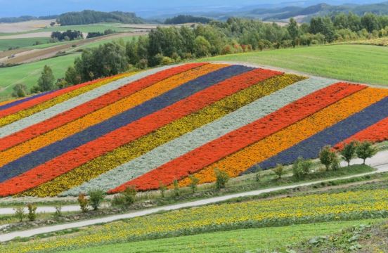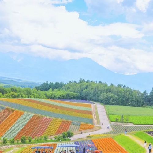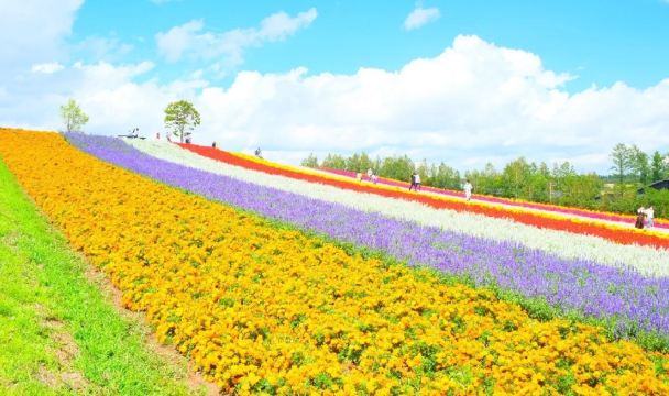 ▲ 四季彩之丘 四季彩之丘位於北海道美瑛,是一片佔地約15公頃的廣闊花田。這裡的丘陵上種植了超過30種花卉,隨著季節變換,薰衣草、波斯菊、向日葵等色彩斑斕的花朵競相開放,形成如畫般的美麗景觀。春夏秋三季均適合遊覽,是美瑛地區著名的賞花勝地。