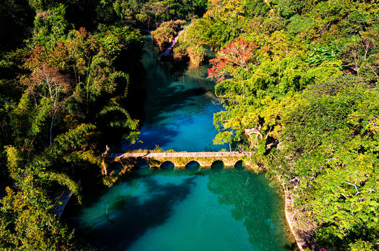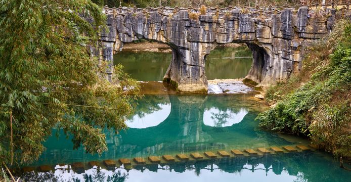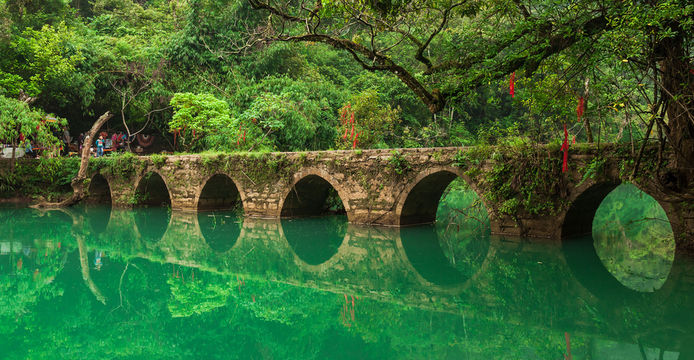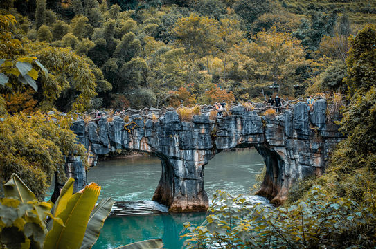 小七孔景區因古橋得名,有臥龍潭、六十八級瀑布、水上森林等景觀,是喀斯特地貌與原始森林交融的5A景區。