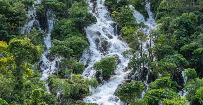 翠谷瀑布位於小七孔景區,因群山蒼翠而得名,瀑布落差高達60多米,遠觀如絲帶般飄逸,近看則水勢磅礡,十分壯觀