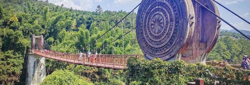 小七孔銅鼓橋橫跨樟江河,始建於1993年,2001年重建,橋身兩端為瑤山銅鼓造型,民族特色濃郁。
