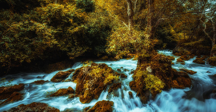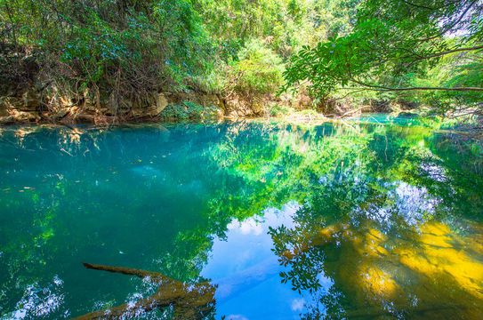 小七孔景區-水上森林,是罕見的岩溶地貌景觀,樹木植根於水中頑石與河床,水、石、樹相依,景觀奇美,宛如漂在水上的森林