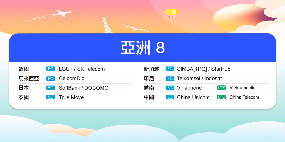 *訊號覆蓋:中國大陸、日本、韓國、新加坡、馬來西亞、泰國、印尼、越南。