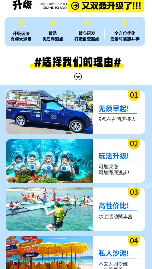 格蘭島真的太好玩了!一天的時間都把控得相當好!帶我們去的海灘人很少,我們玩的很盡興。導遊和服務都很好,很貼心!會經常提醒我們要注意攜帶隨身物品,講話也很溫柔客氣!下次再來芭提雅的話還會找你們家,沖沖衝