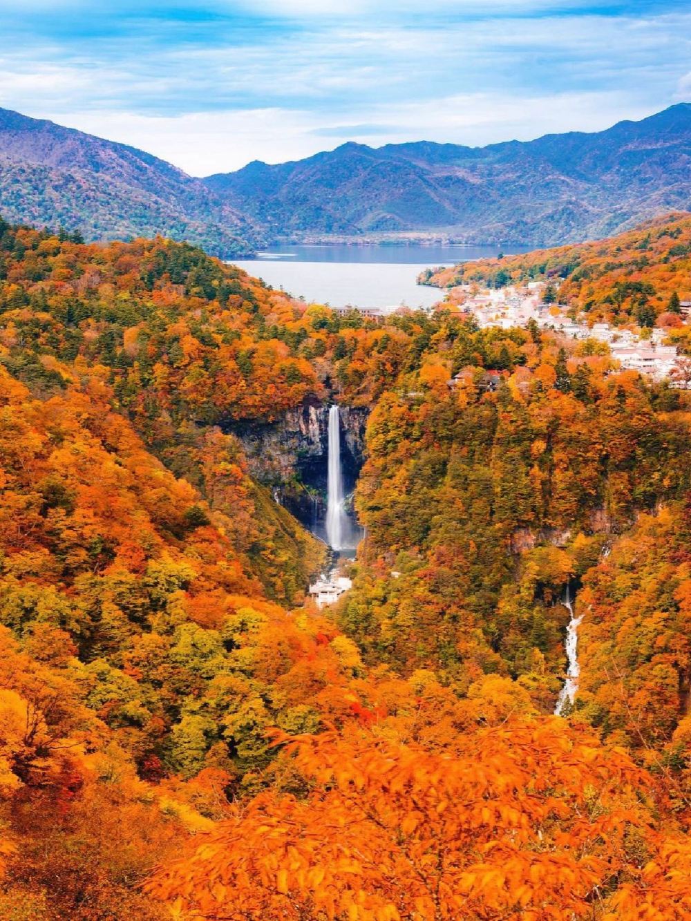 ▲ 華嚴瀑布-日本三大名瀑之一,著名遊覽地。中禪寺湖水形成東端的大尻川,橫切男體山,從700米高處流下形成瀑布主要部分,高99米。上部岩石向前突出,岩隙中流出12個小瀑布。秋季四周紅葉漫布,景觀幽美,為日光國立公園的遊覽中心,這裡非常適合拍照,有高山流水的意境。