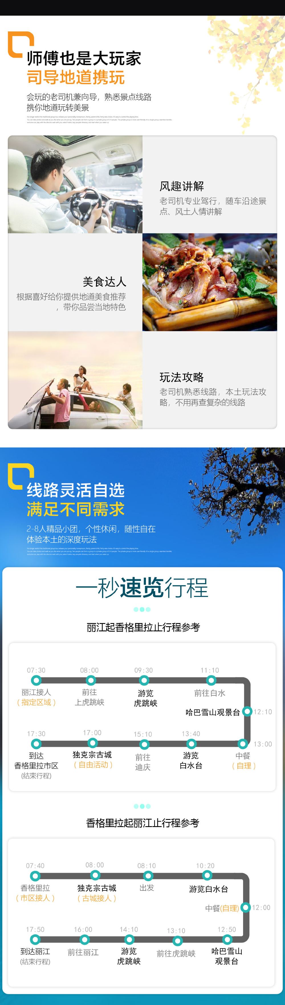447雙人,感覺還不錯,全程不到一萬步。司機早上7點半來接的,九座商務車。因為想和同伴挨着,衹能坐在最後一排。因為後面放了行李所以最後一排座位沒法調,挺憋屈的。 記得坐在右邊,一路觀賞峽谷和雪山。司機在抵達虎跳峽之前會把大家放在一個服務區休息,一下服務區就有個導遊來推銷,記得不要買任何東西,虎跳峽海拔很低,白水台也和麗江古城差不多,完全不會高反。如果擔心高反,記得麗江就把東西買好。PS 記得帶午飯。還有,不要買虎跳峽電梯,走路五分鐘到十分鐘就下去了,台階很平整好走。 最後司機會把大家送到酒店,或者距離酒店最近酒店最近的路口。路上司機規定玩耍時間,同行人都很守時,四點出頭我們就到酒店了。