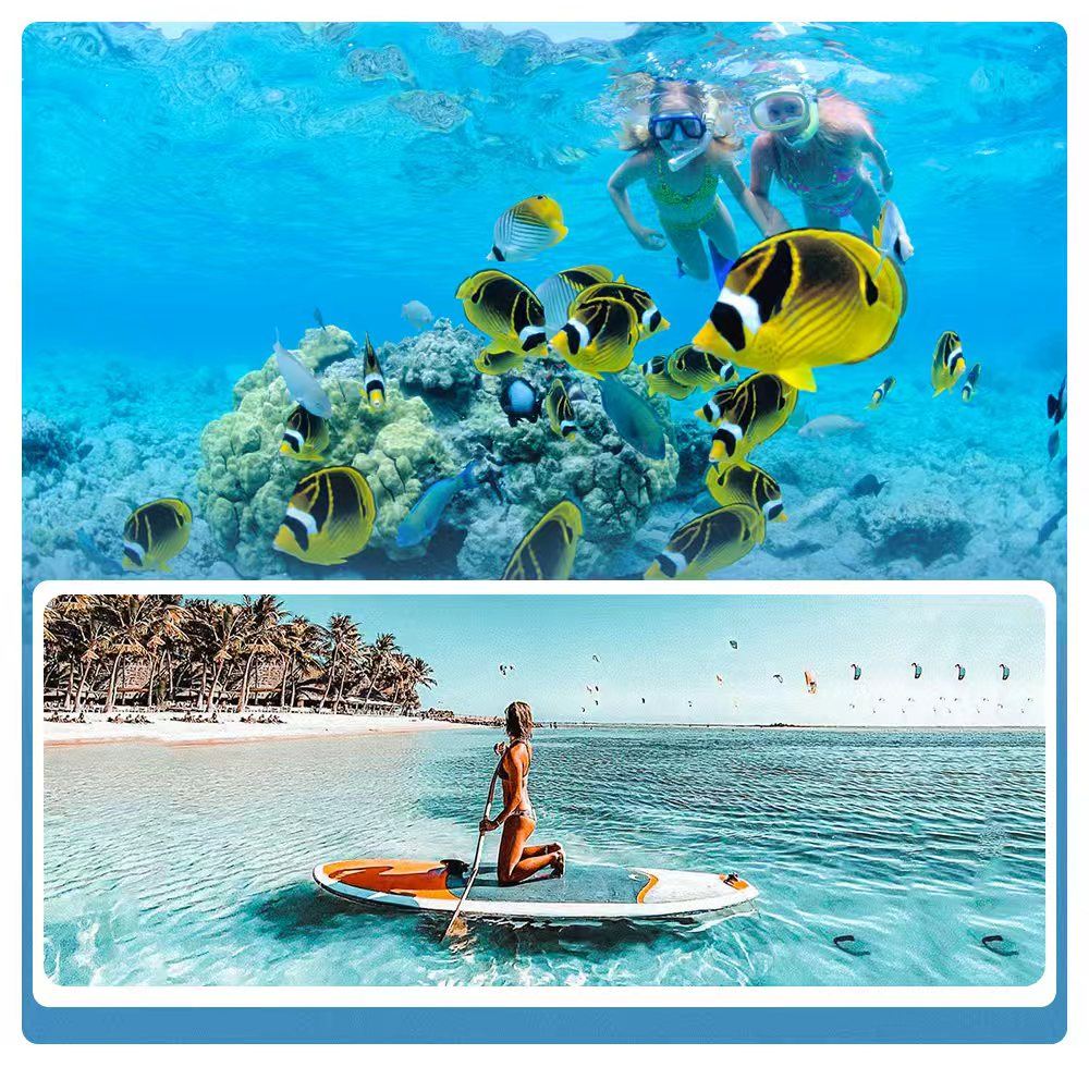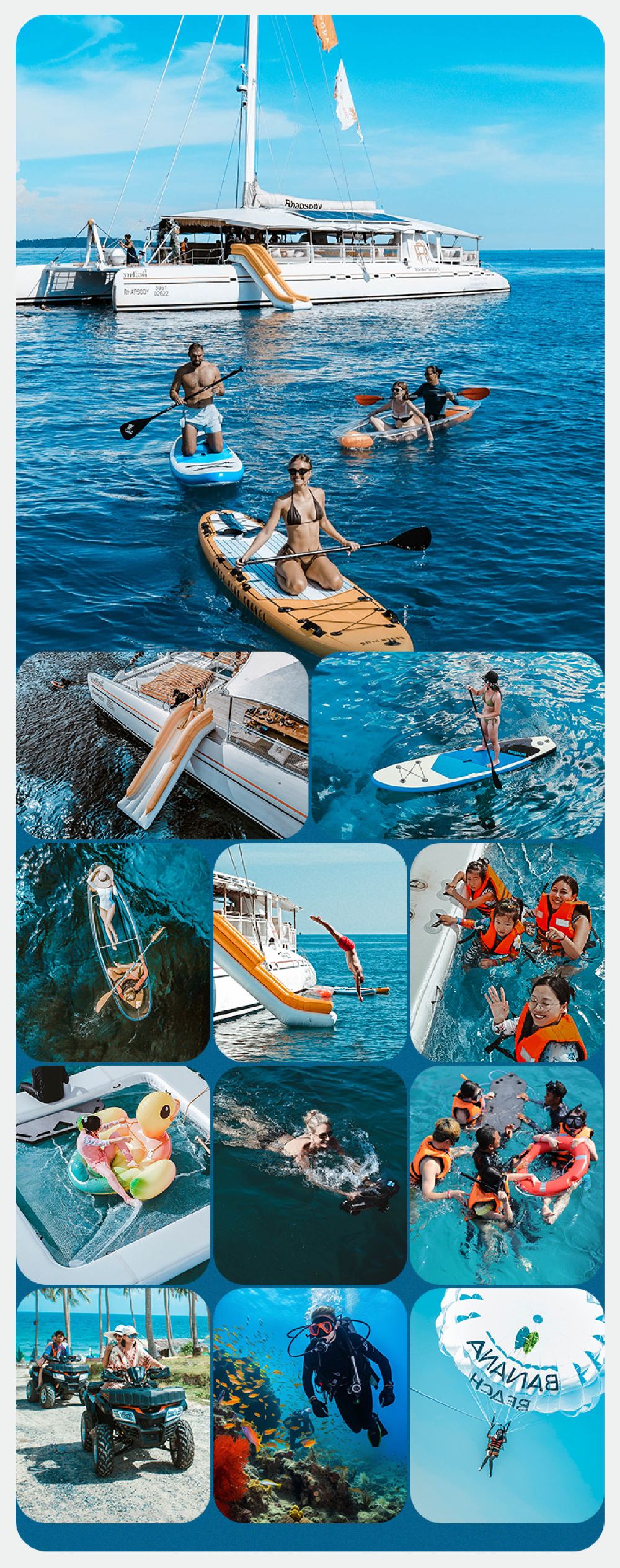 ● N種水上玩法:浮潛(一次性咬嘴)、海上滑梯、槳板、漂浮泳池、透明船、鴨鴨船、水上助推器、跳水