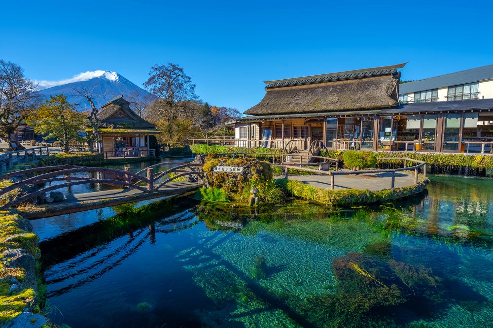 ▲ 忍野八海:忍野八海是由富士山雪水融化後經過地層過濾形成的八個清澈泉池。池水透明度極高,被譽為「日本九寨」。這裡保留了古樸的村落風貌,小橋流水與遠處富士山構成一幅靜謐的田園畫卷。