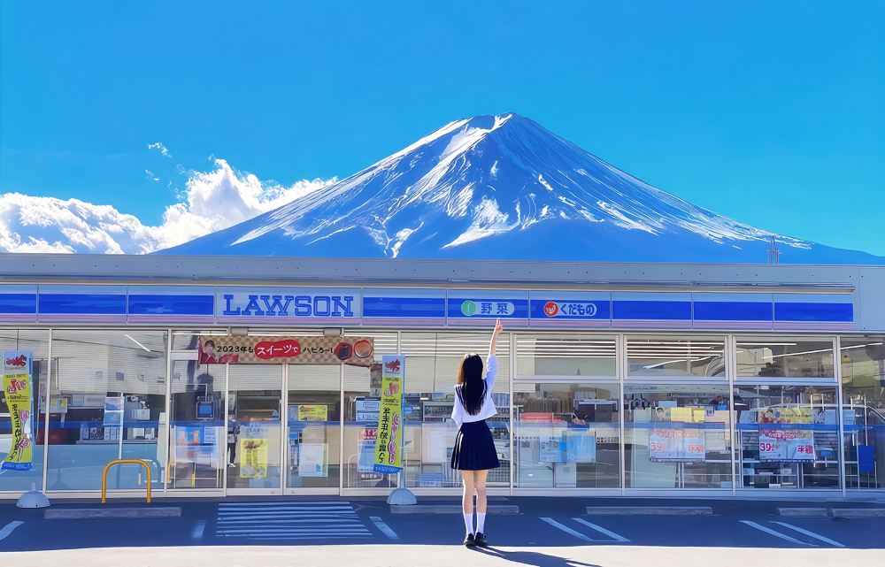 ▲ 河口湖網紅羅森便利店:位於河口湖車站附近的羅森便利店,因其與後方富士山同框的獨特視角而成為熱門打卡點。招牌與雄偉山巒形成的奇妙構圖,吸引了無數遊客在此駐足留念。