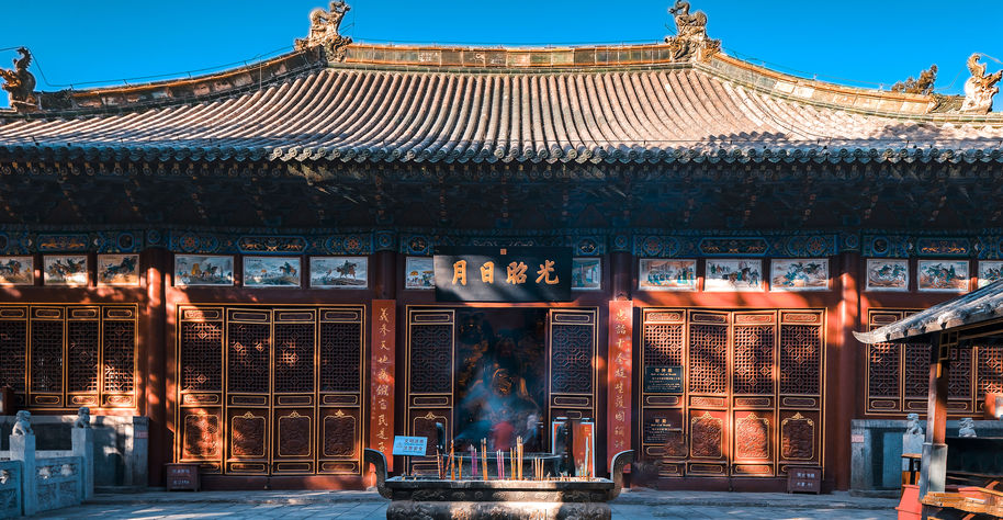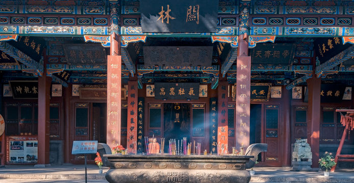 建築莊嚴宏偉,供奉著關羽的神像,體現了對關羽忠義精神的尊崇和傳承,具有濃厚的歷史文化氛圍和宗教文化