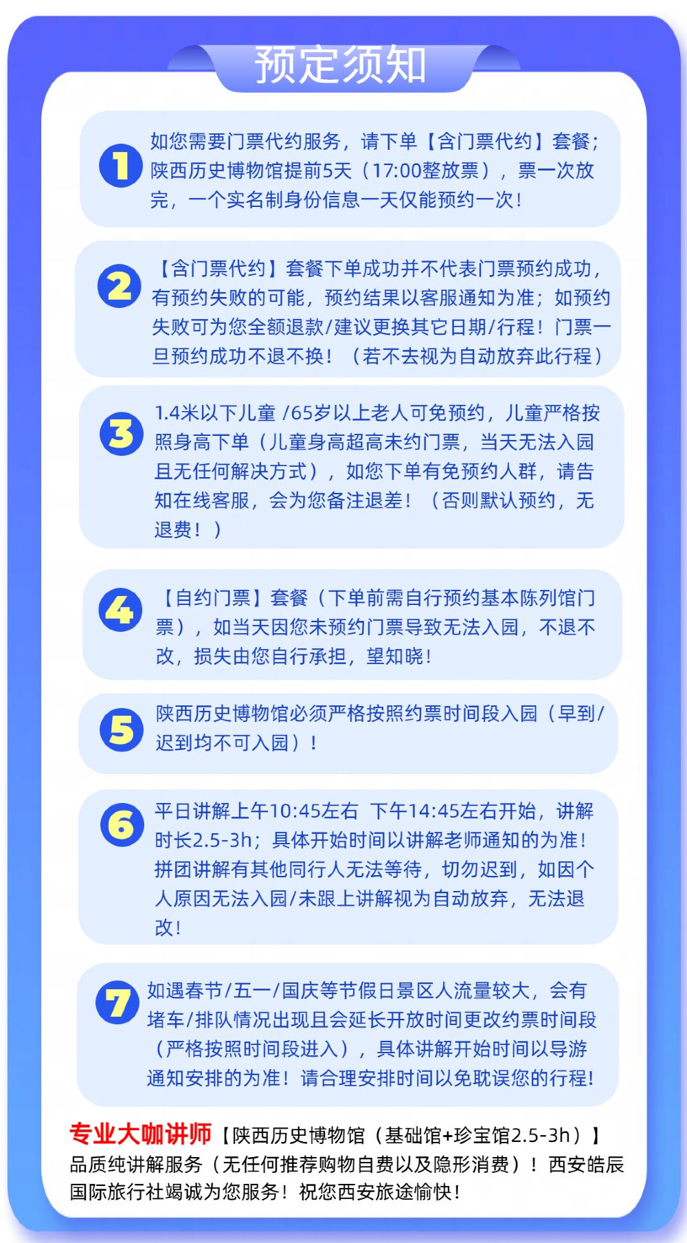 1、陝西歷史博物館為公益性博物館【門票免費,需提前五天預約】,下單【含門票】套餐默認幫忙預約基礎館門票,出票概率99%,出票結果以客戶服務支援通知為準,未出票可以改期或者全額退款;