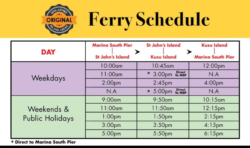 - 渡輪每日營運。請瀏覽 https://www.islandcruise.com.sg 查看渡輪時間表。