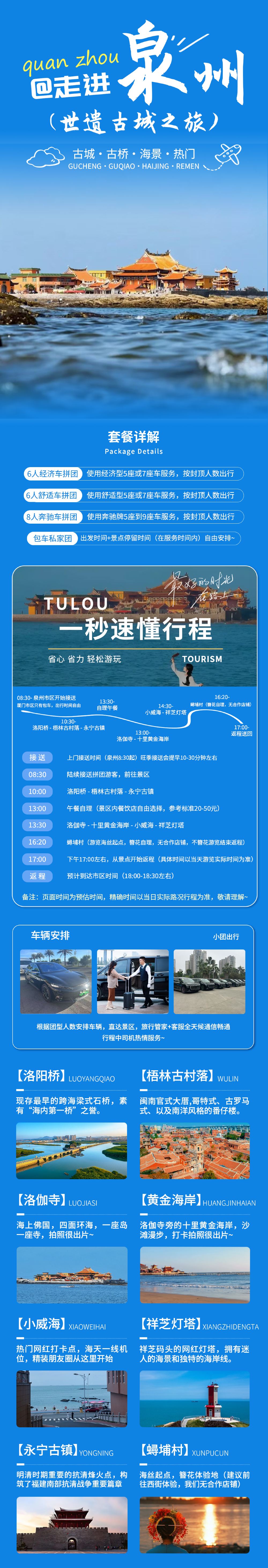 - 晚出發服務更精細,讓您更了解泉州,我們精選世遺泉州八大多元化景點:洛陽橋+晉江梧林傳統村落+永寧古衛城+洛伽寺+十里黃金海岸+小威海+祥芝燈塔+蟳鋪村(世遺歷史人文景點,古村古鎮,網紅打卡出片景點、超絕海景)車輛直達景點門口,減少步行時間,節省體力充分遊玩,非常適合情侶朋友、或帶長者小孩遊玩,輕鬆愉快一整天,司機兼導遊服務,含講解指引拍照機位,也可以幫忙拍照哦~