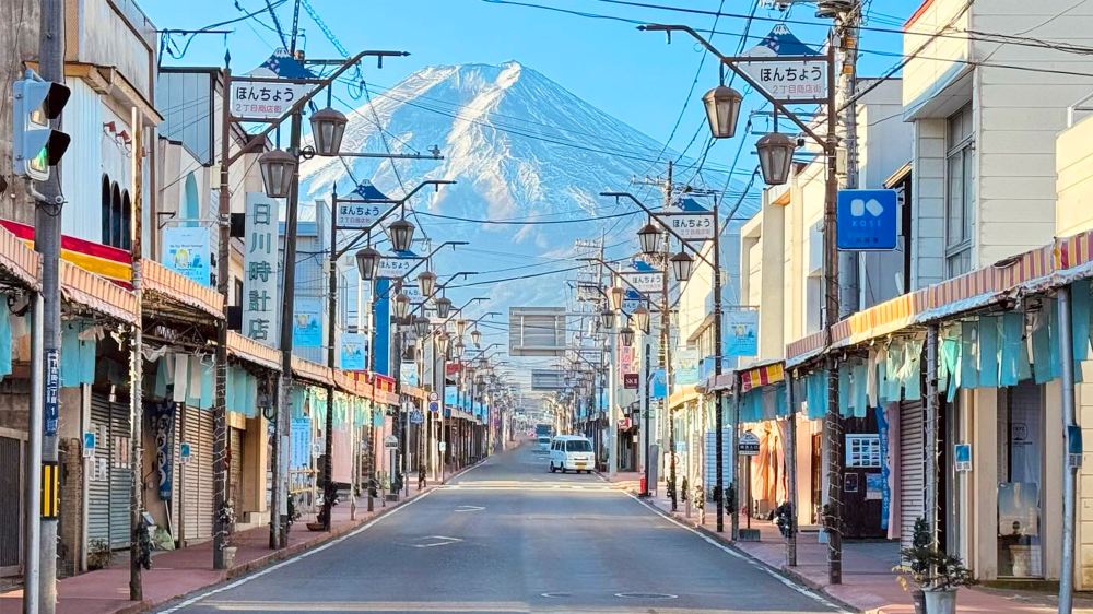 ▲ 日川時計店,這條街道與富士山自然對齊,是許多攝影愛好者心中的私藏角度。街道保留了昭和年代的懷舊氛圍,延伸至富士山腳下,時空在昭和風商舖間凝滯。無需刻意構圖,街景自然為鏡頭加載電影濾鏡。