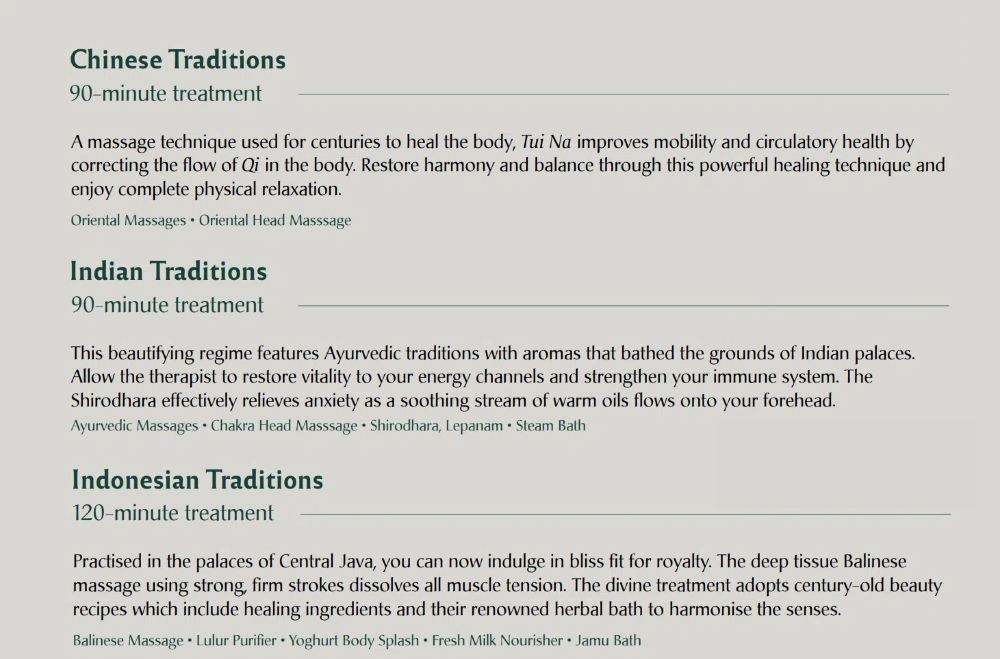 60分鐘身體按摩,60分鐘面部護理,30分鐘身體磨砂,30分鐘泡泡浴,30分鐘身體滋養(body conditioner)
