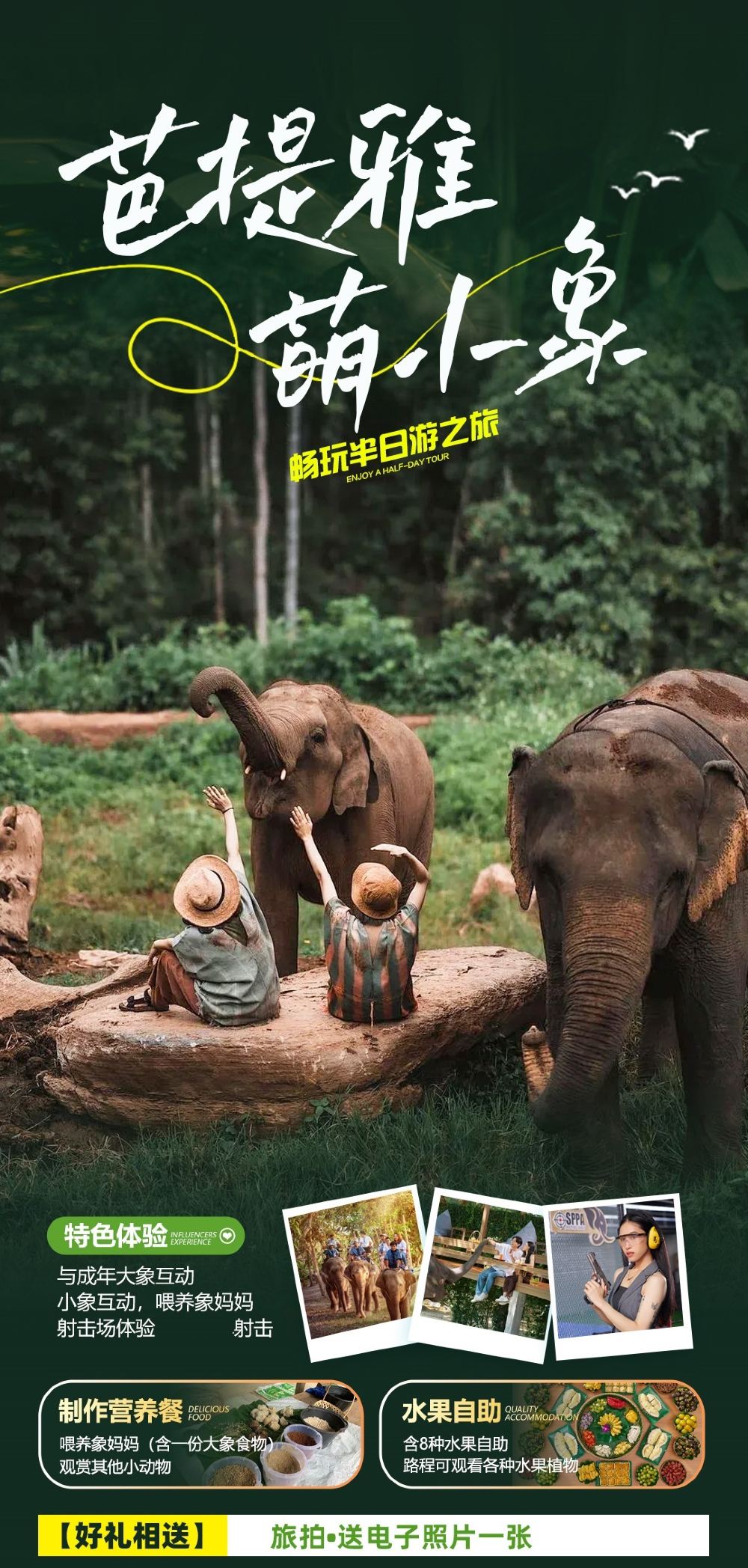 - 14:30與出生1-12個月的小象互動,餵飼象媽媽(包含一份大象食物),觀賞其他小動物