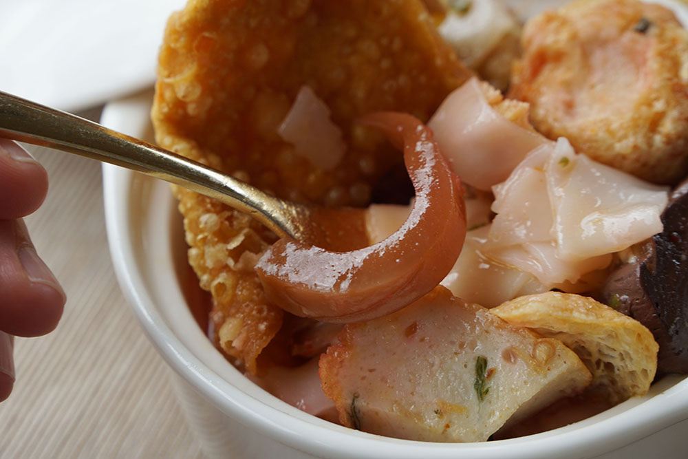 泰國街頭小吃「映豆腐」:粿條配料相當豐富,包括魷魚、魚板、魚丸、豬血、豆腐、炸雲吞皮及粄條等,湯頭清爽容易入口