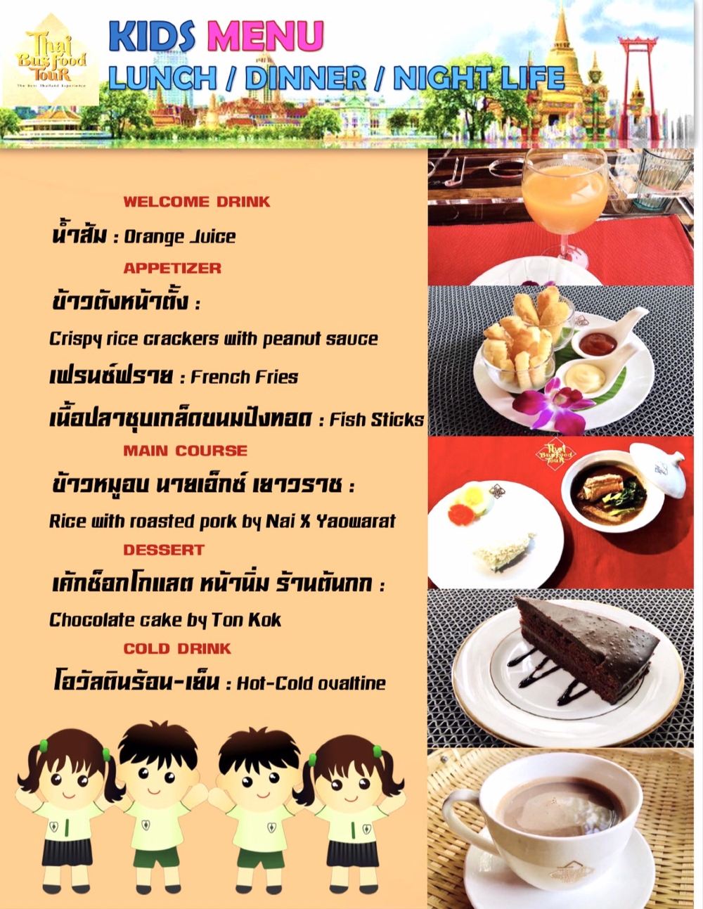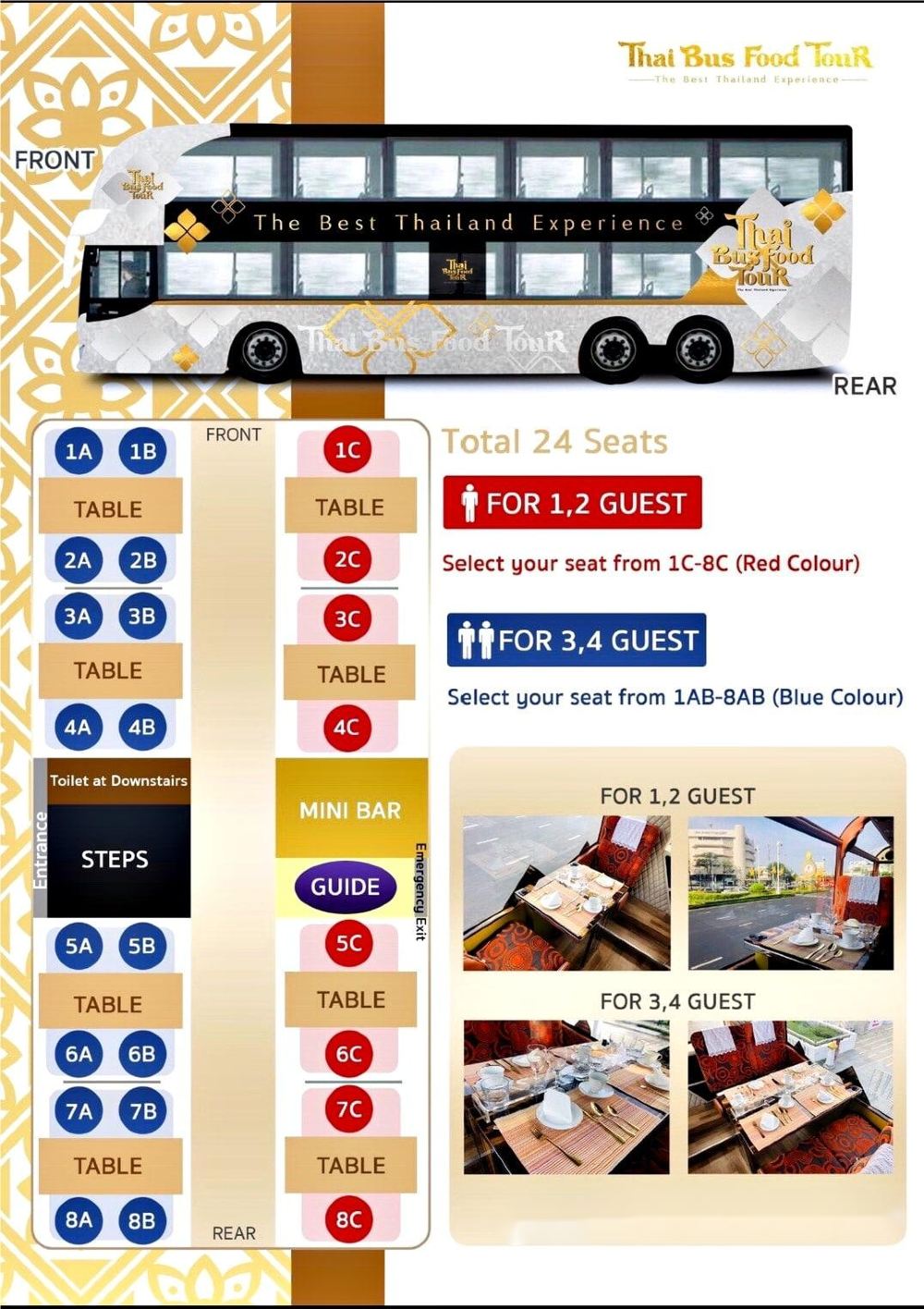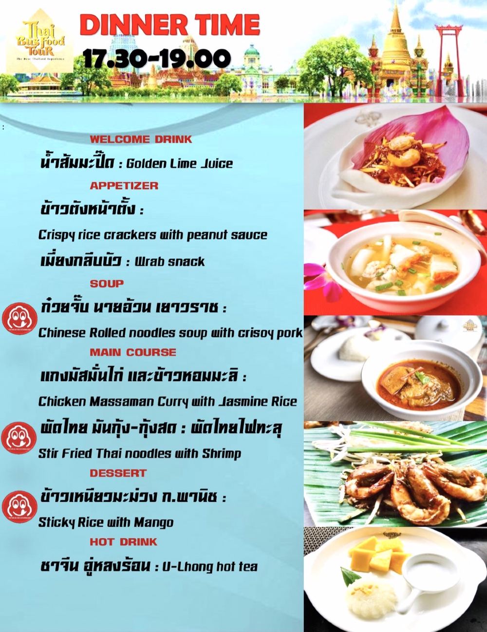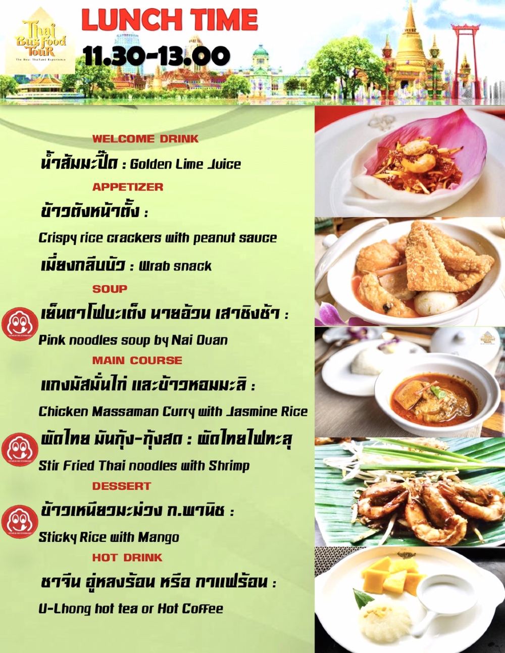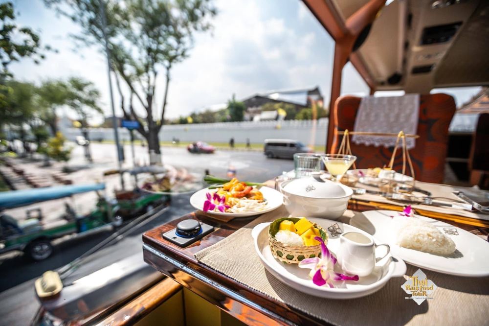 Thai Bus Food Tour是泰國首個結合旅遊與泰式料理的美食觀光雙層巴士,在近2小時的巴士旅程中,除了可以一次飽覽曼谷老城區超過20個景點外,還能同時品嚐地道的泰國美食,當中包括米芝蓮推薦料理及多間人氣店家的餐點,讓您無需排隊即可享受米芝蓮級數的美味。