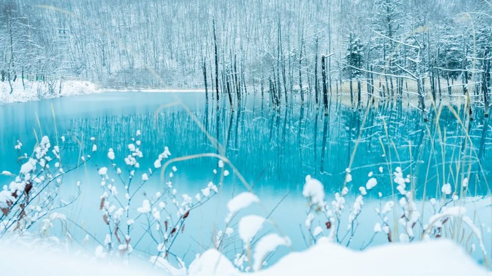 ▲ 白金青池, 美瑛地區知名觀光景點,是防災工程中意外形成的人造湖。湖水呈現鮮明藍色,「美瑛藍」 隨季節、時段、天氣變化,搭配周圍鬱鬱蔥蔥和落葉松枯木,宛如童話世界。