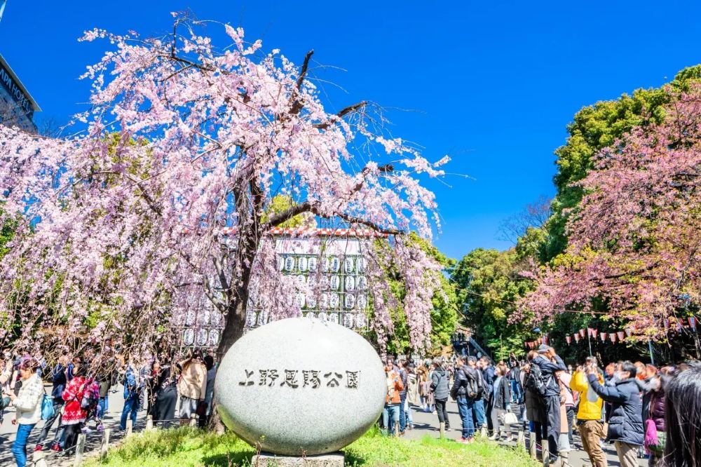 ▲ 【上野恩賜公園】每年春季櫻花盛開時,上野公園都會吸引超過200萬遊客,其中大部分遊客都會聚集在靠近上野動物園入口的主幹道上。這裡是熱鬧的賞櫻區,兩旁櫻花樹整齊排列,走在其中如同穿越粉色隧道。在賞櫻季高峰期,遊客在享受野餐的人群中擇路而行。
