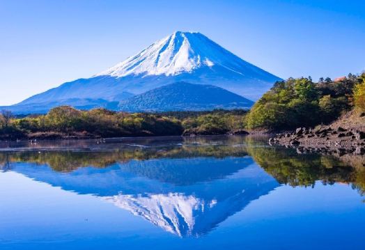 ▲ 精進湖是日本富士五湖之一,因富士山火山活動形成的水堰塞湖,為淡水湖。從精進湖北岸眺望,富士山與前方海拔較低的大室山交疊,猶如母親抱著孩子,形成著名的「抱子富士」 景觀。