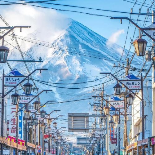 ▲ 天梯小鎮是一條純日式風格的街道,因路的盡頭就是富士山,彷彿一條通往富士山的天梯而得名。這裡有昭和時代的舊街道味道,路燈和交錯的電線增添了二次元感覺,富士山在街道盡頭成為焦點,整體畫面極具日式小清新風格,拍照氛圍滿滿。