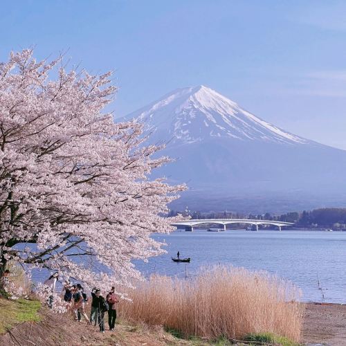 ▲ 春季可在河口湖北岸地區附近欣賞美麗的‘櫻富士’ 夏季可在河口湖大石公園欣賞‘青富士’(在夏季山頭沒有積雪時,山的表面呈現青藍色的狀態。) 秋季可在河口湖楓葉迴廊附近欣賞秋季限定的‘紅楓富士’ 冬季可在河口湖大石公園欣賞清晰湛藍的經典‘雪頂富士’