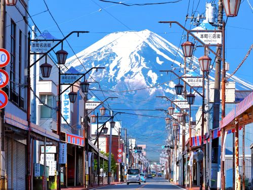 ▲ 【天梯小鎮】【日川時計店】ins爆紅的網紅打卡景點日川時計店,這裡就像通向天梯的小鎮,可拍到日式街景,觀賞富士山跟街道融合一體的美景。通往富士山的街道,安靜的街道像一條雲梯,路的盡頭就是富士山,無限接近卻觸不可及。