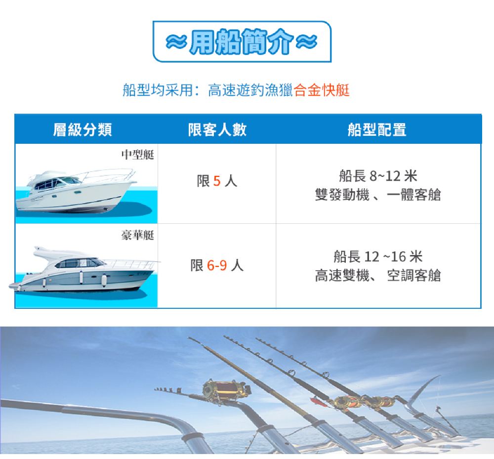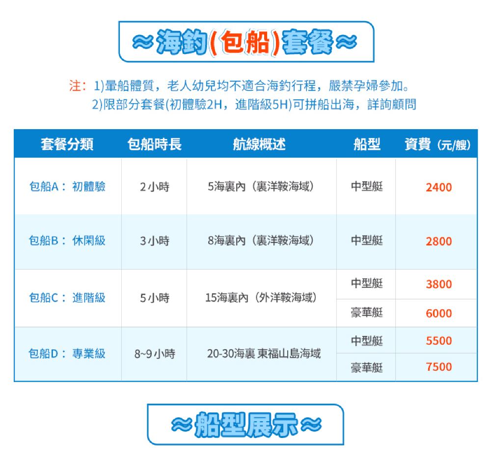 5. 出海行程可能因惡劣天氣、船隻突發故障、航線封鎖等各類不可抗力因素造成變更調整,我們將根據包船售後須知及網頁退改規則處理。如以上不可抗力情況產生訂單以外的損失,無法售後賠付,請提前知曉!