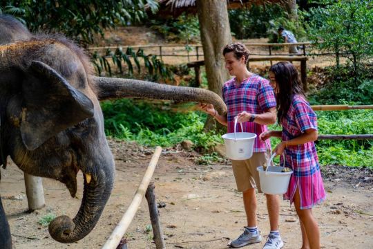 ▲ 餵大象行程(餵大象+給大象沖水) 上午場(MORNING)09:30-11:00 下午場(AFTERNOON)14:00-15:30 行程介紹: 到達擁抱大象保護營。享用Welcome飲品,咖啡,茶和小食更換營地民族服飾學習製作維他命秋(Vitamin Ball)和藥草壓縮球餵大象吃香蕉/甘蔗,親密接觸大象,和大像一起拍照,給大象沖水客人洗澡(提供熱水淋浴),換衣服